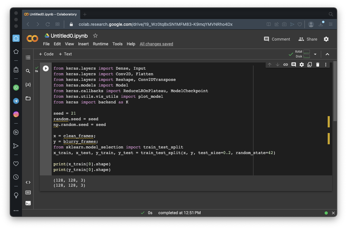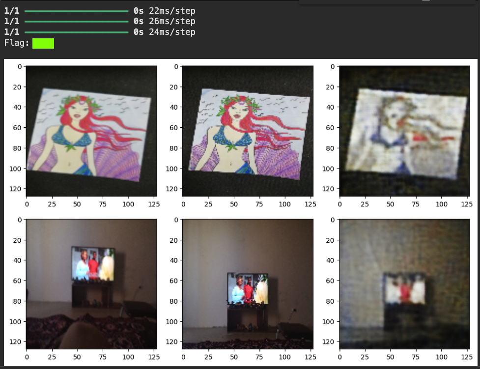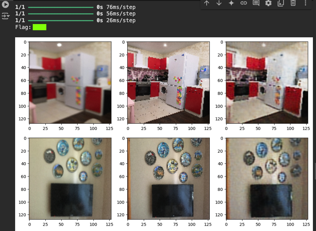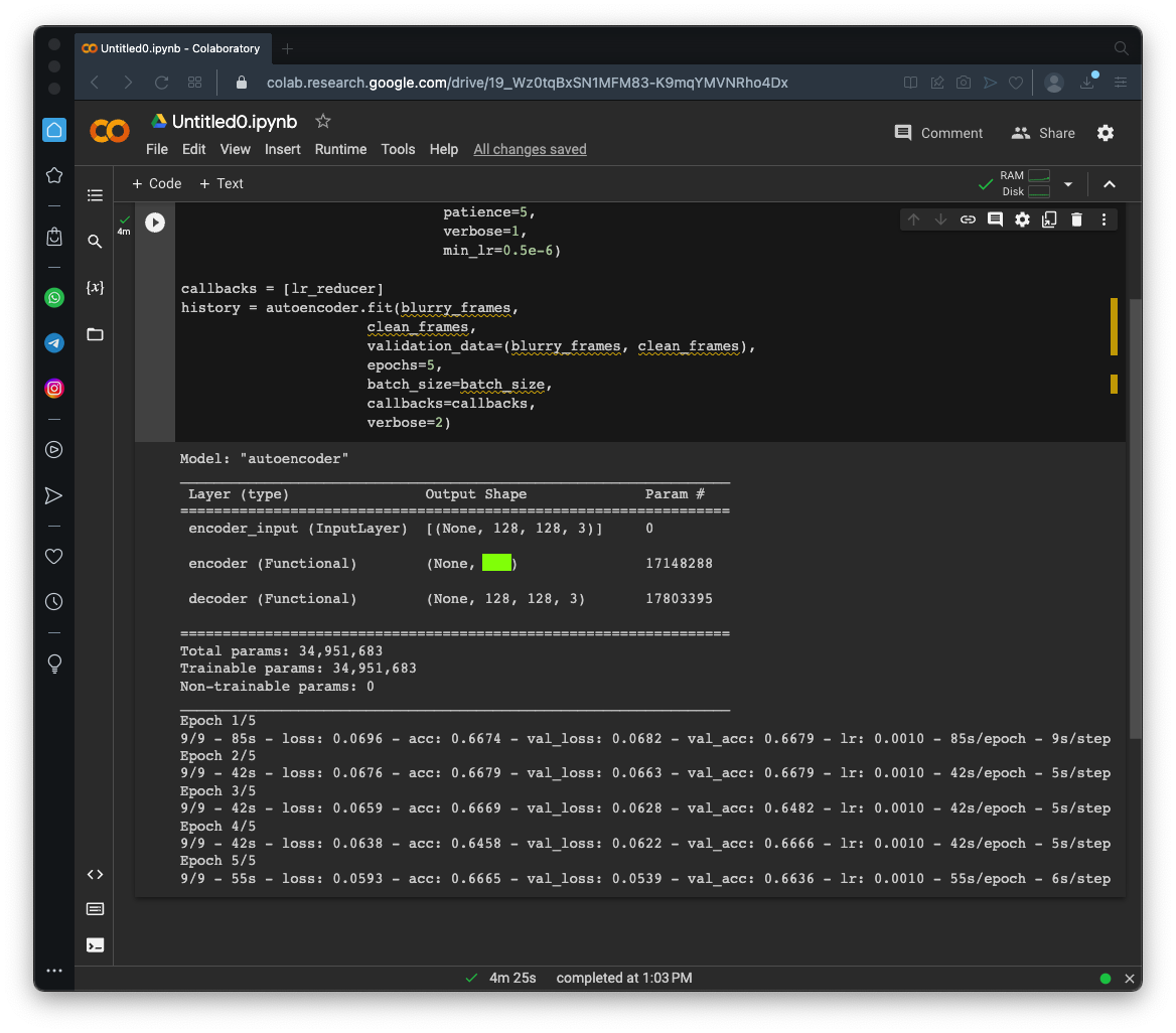 autoencoder = Model(inputs, decoder(encoder(inputs)), name='autoencoder') autoencoder.summary() autoencoder.compile(loss='mse', optimizer='adam',metrics=["acc"]) lr_reducer = ReduceLROnPlateau(factor=np.sqrt(0.1), cooldown=0, patience=5, verbose=1, min_lr=0.5e-6) callbacks = [lr_reducer] history = autoencoder.fit(blurry_frames, clean_frames, validation_data=(blurry_frames, clean_frames), epochs=5, batch_size=batch_size, callbacks=callbacks, verbose=2)It will take about 5 minutes to go through 5 epochs of training.