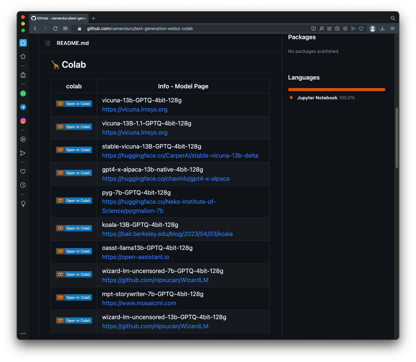 A colab gradio web UI for running Large Language ModelsScroll down to the "Colab" section, as shown below.