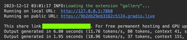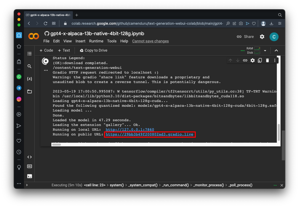 After about five minutes, you'll see a public URL for your GPT server ending in "gradio.live", outlined in red in the image below.