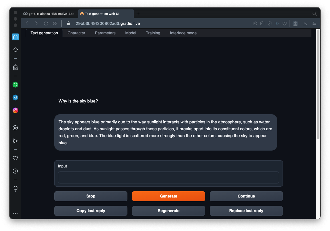 A colab gradio web UI for running Large Language ModelsLaunch the stable-vicuna-13B-GPTQ-4bit-128g model.