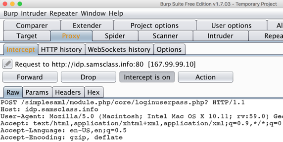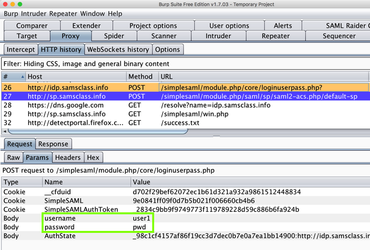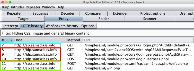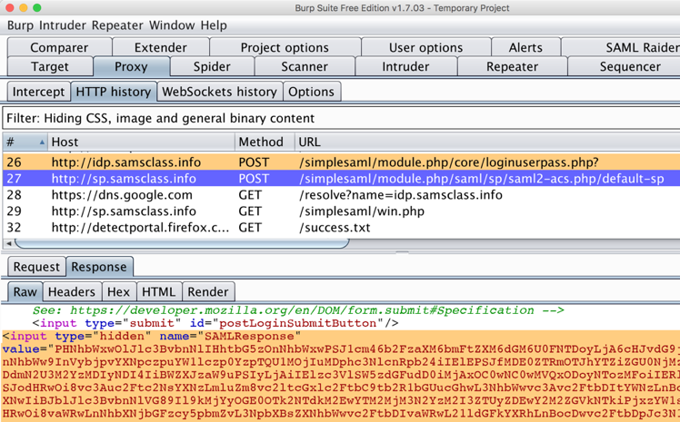 In Burp, in the history list, click the POST request made to a Host of sp.samsclass.info and a URL ending in default-sp. In the figure above, it is request number 27.