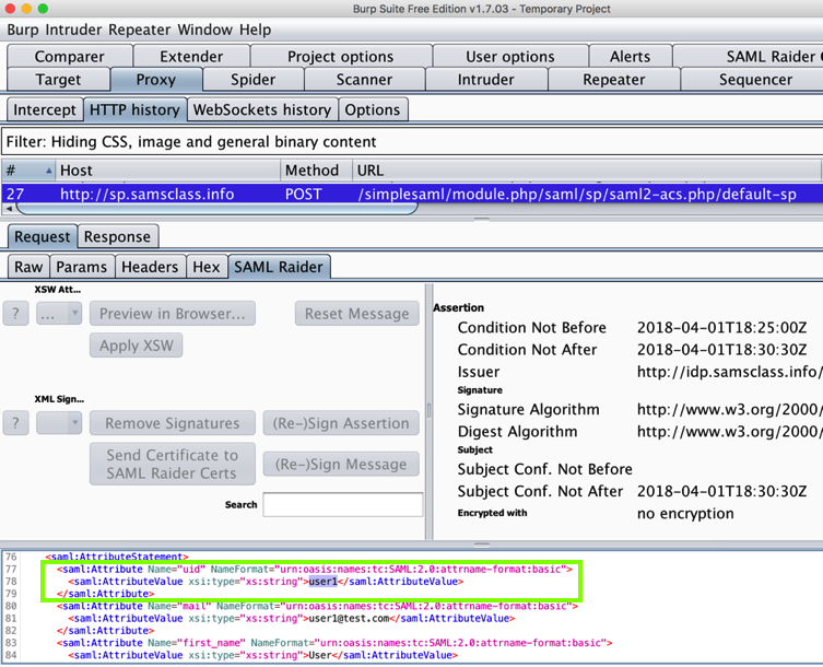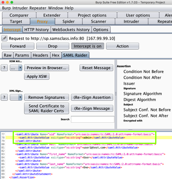 The next request is the one we want. In the lower pane, click the "SAML Raider" tab. In the lowest pane, scroll to the bottom and find the "uid" attribute, which is currently user1. Double-click it, delete the current value, and type in admin instead, as shown below.