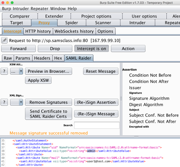 We don't have a way to correct the signature, so we'll just ignore that problem and see if the Service Provider falls for it. Maybe the Service Provider isn't actually validating the signatures. This happens frequently, because people have difficulty correctly configuring validation tests and just disable them.