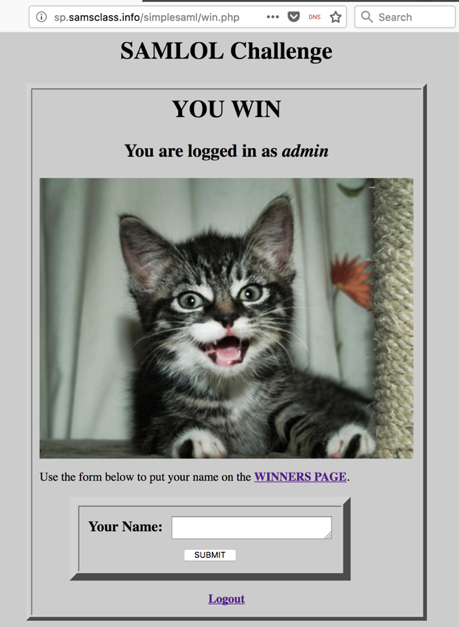 The SAMLOL Challenge page opens, as shown below. Notice the URL--it begins with "sp.samsclass.info". This is my Service Provider.