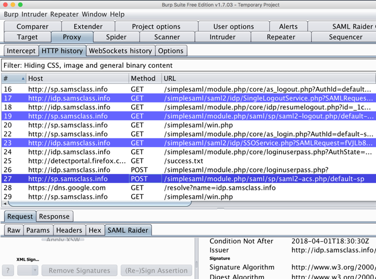 In Burp, in the history list, click one of the purple requests. In the lower pane, click the "SAML Raider" tab, as shown above.