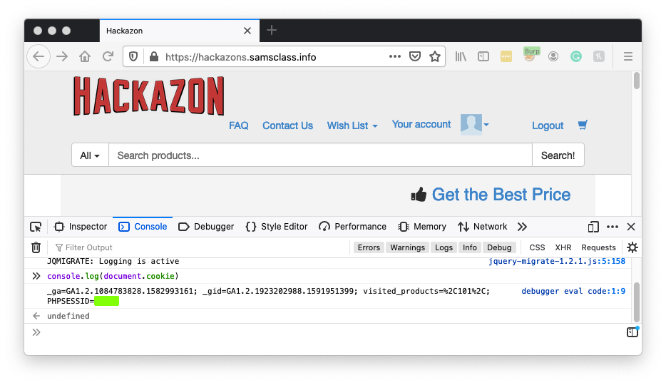 In Firefox, in the Web Console, execute this command:The flagĀ is the PHPSESSID value, covered by a green box in the image below.
