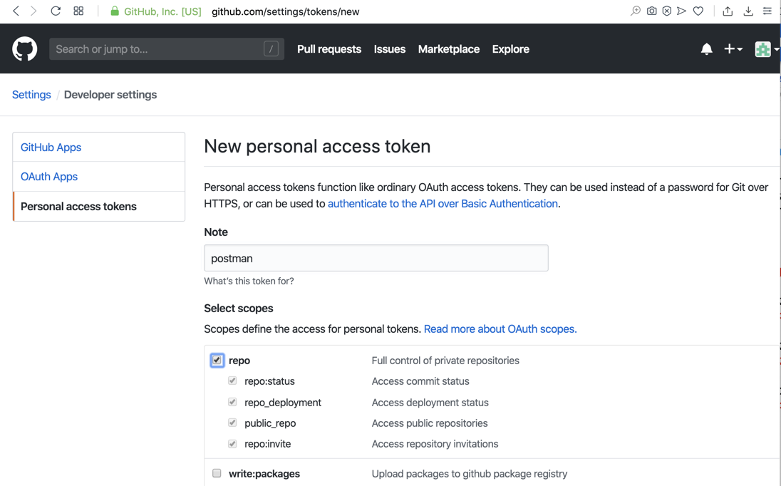 In the "New personal access token" page, enter a Note of postman and check the repo box, as shown below.