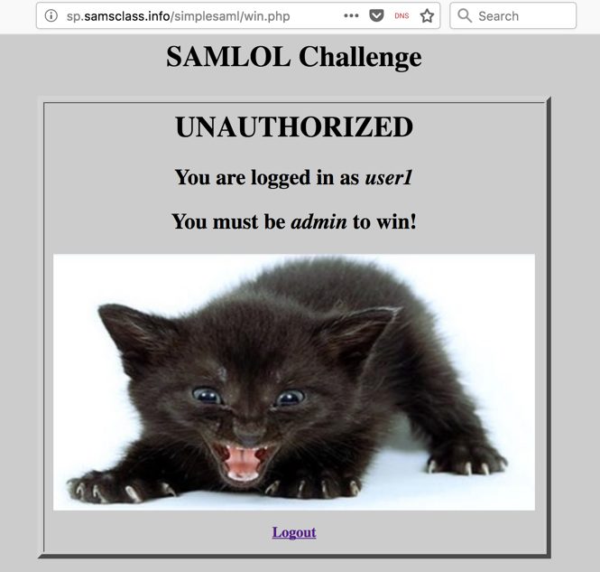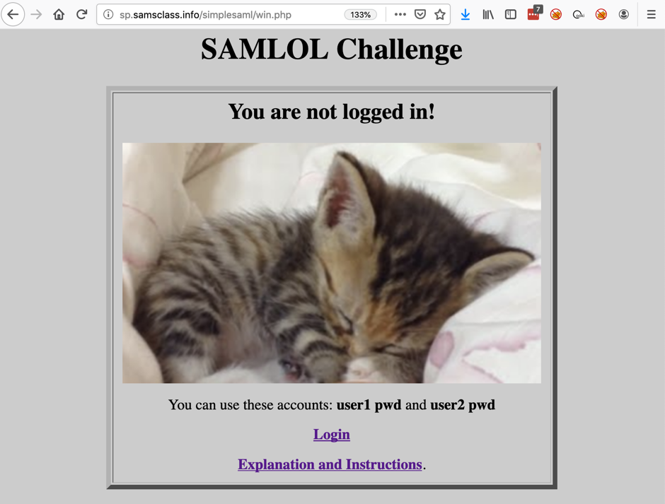 The SAMLOL Challenge page opens, as shown below. Notice the URL--it begins with "sp.samsclass.info". This is my Service Provider.