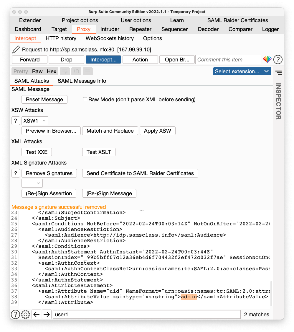 In Burp's browser, the winning page appears, as shown below. My SAML configuration has a "fail-open" vulnerability, which misinterprets a missing signature as valid.
