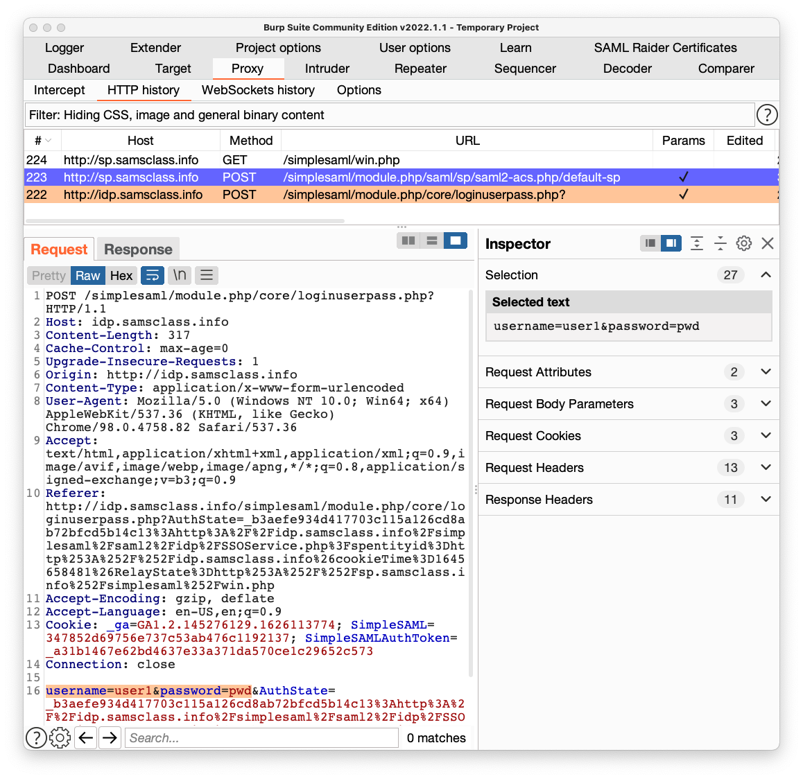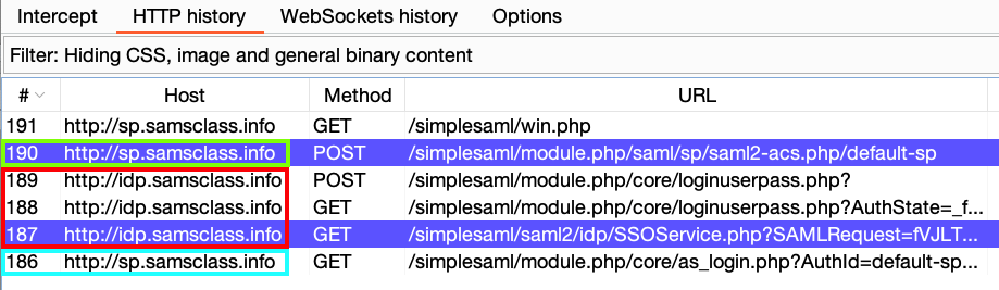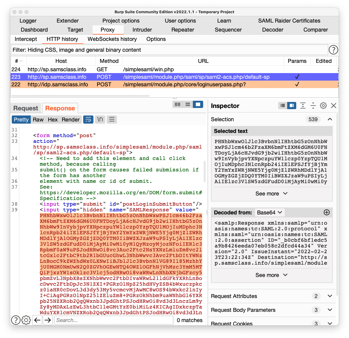 In Burp, in the history list, click the POST request made to a Host of sp.samsclass.info and a URL ending in default-sp. In the figure above, it is request number 223.