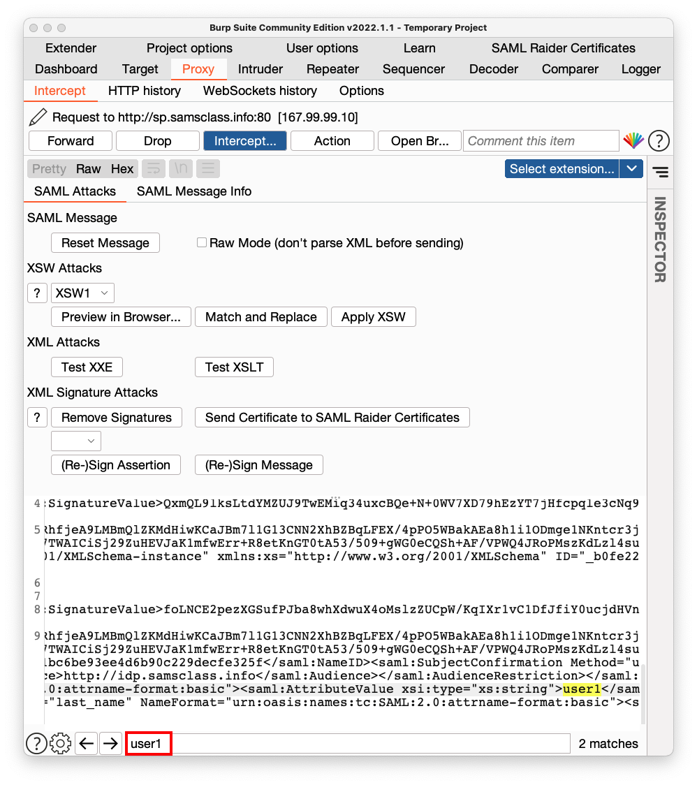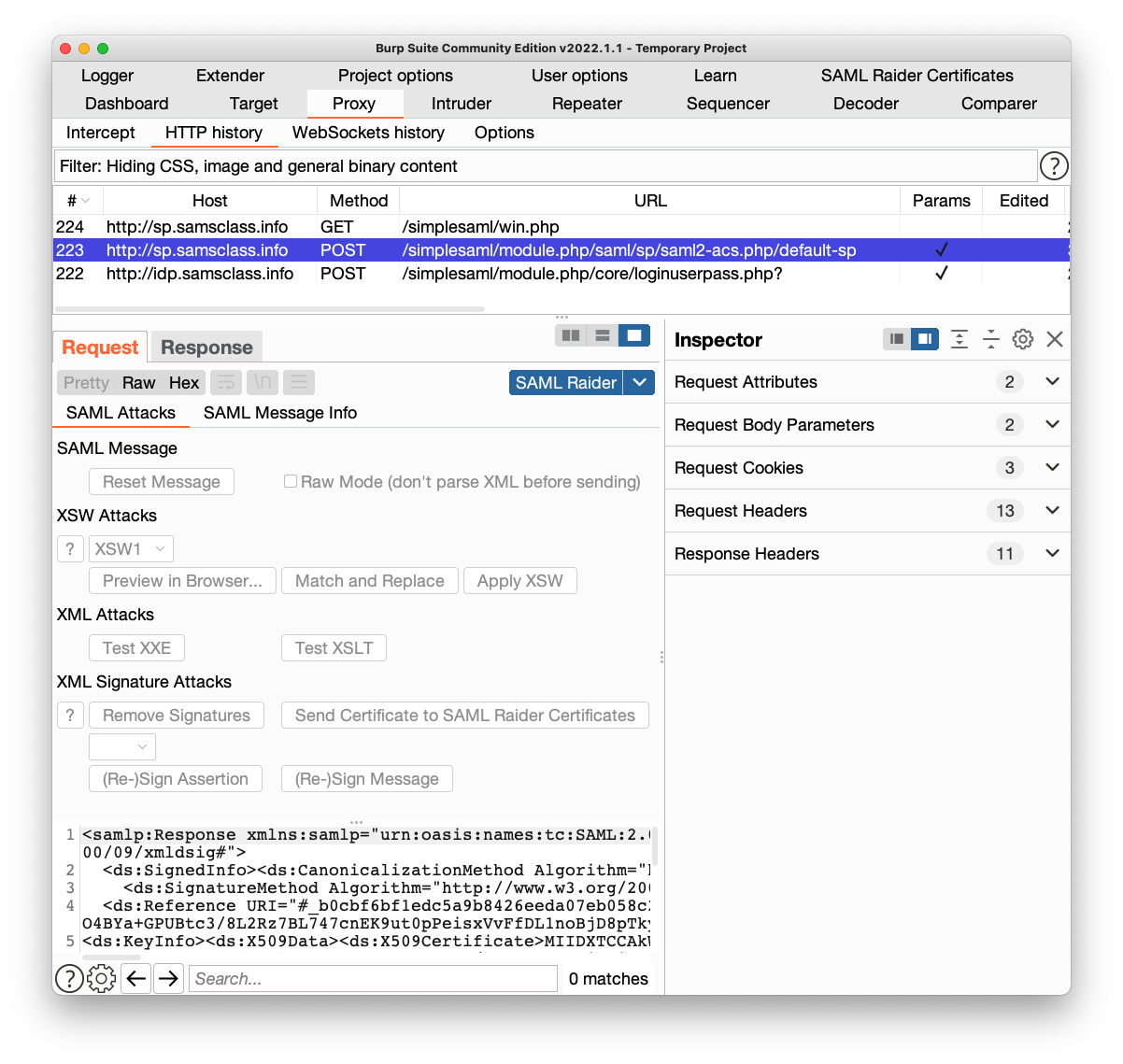 The next request is the one we want. In the lower pane, click the "SAML Attacks" sub-tab.