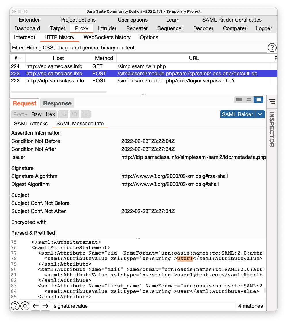 In the lower left pane, the XML contents of the SAMLResponse are shown. Scroll through it. There are many items, including two long SignatureValue fields.