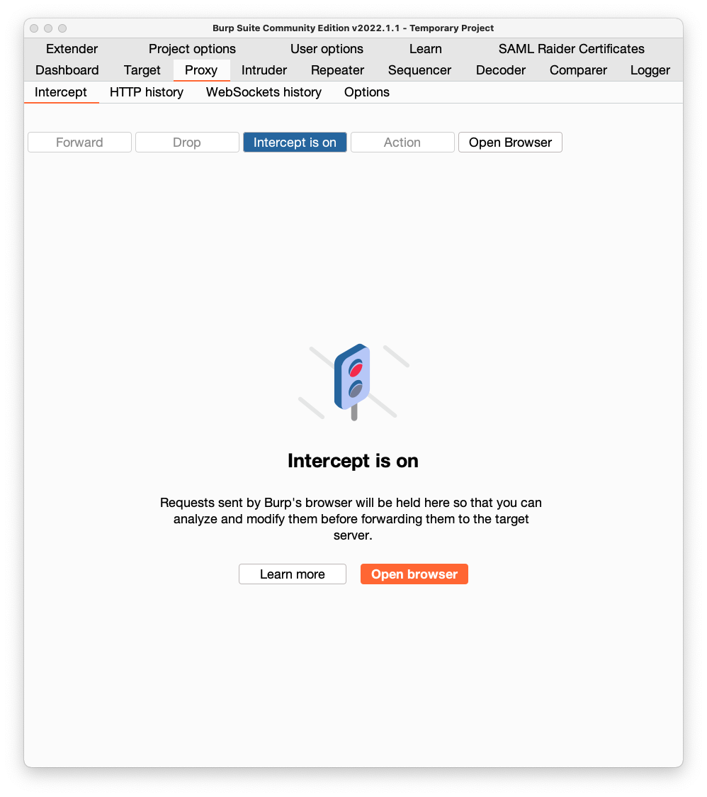 Click the "Intercept is off" button, so the message changes to "Intercept is on", as shown below.