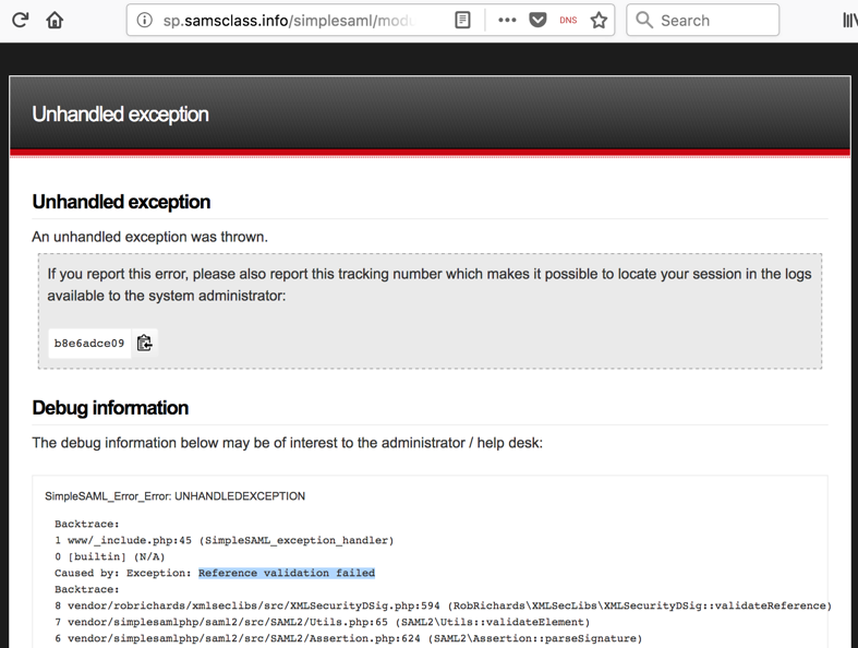In Burp's browser, an error message appears, as shown below, saying "Reference validation failed". The Service Provider checked the signature, and detected our forgery attempt, so we did not win yet.