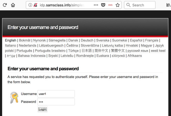 A new page opens, with a URL starting with "idp.samsclass.info", as shown below. This is my Identity Provider.