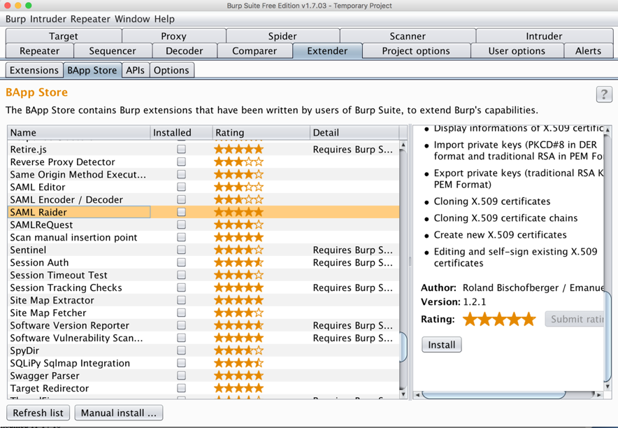 In the left pane, scroll down and click "SAML Raider". In the right pane, scroll down and click the Install button, as shown below.