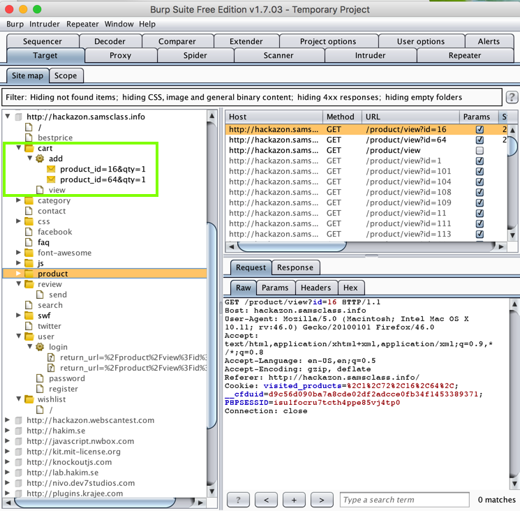 In Burp, on the "Site map" tab, expand http://hackazon.samsclass.info. Expand cart and add. You should see your two items, as outlined in green in the image below.