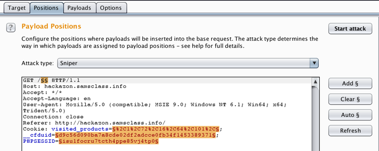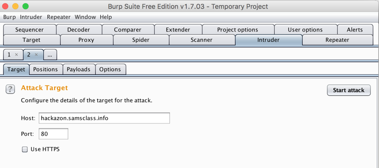 In Burp, click the Intruder tab. On the Target sub-tab, the Host: should be "hackazon.samsclass.info", as shown below.