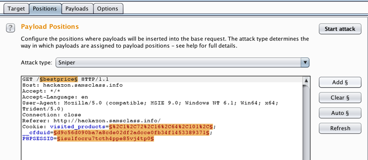 Click the Positions sub-tab. In the GET line, double-click bestprice to highlight it. On the right side, click the "Add §" button. These "section marks" indicate where Burp Intruder will insert words.