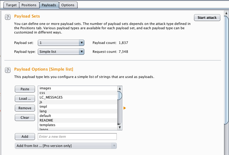 In Burp, click the Payloads sub-tab. There are no wordlists included in the free version of Burp.