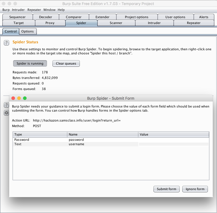 In Burp, click the Spider tab. After a few seconds, Burp finds some forms and pops up a box asking how to handle forms.
