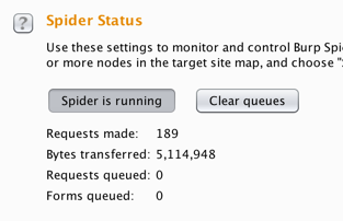 The spider should finish within a few seconds. You can tell it's done because the "Requests queued" and "Forms queued" values are zero, as shown below.