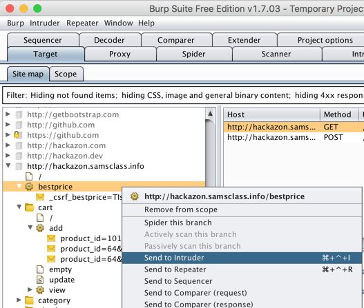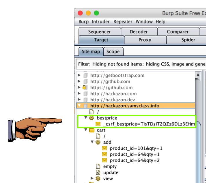 In Burp, on the Target tab, on the "Site map" sub-tab, expand bestprice. You should see an item beginning _csrf_bestprice, as shown below. This is a part of the application the spider found.