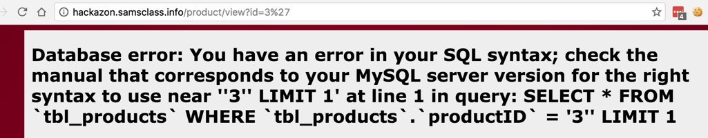 Click any product. Then add an apostrophe to the end of the URL, so you see a SQL error message, as shown below.