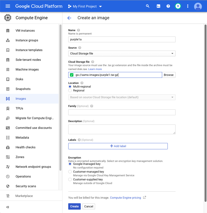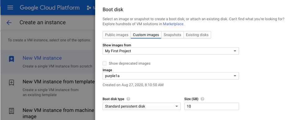 In the "Boot disk" box, on the "Custom images" tab, select an Image of purple1, as shown below.