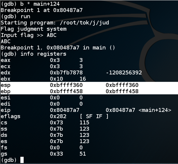 I input a flag guess of "ABC", and the program hit its breakpoint.