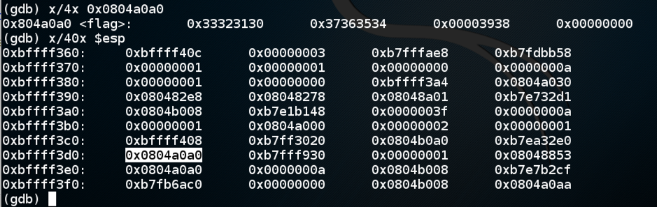 I used these commands to view the memory near 0x0804a0a0, and the stack: