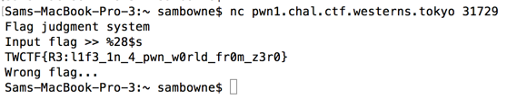 And entering "%28$s" prints the string that address points to, which is the flag! This, of course, is the fake flag I put on my machine.