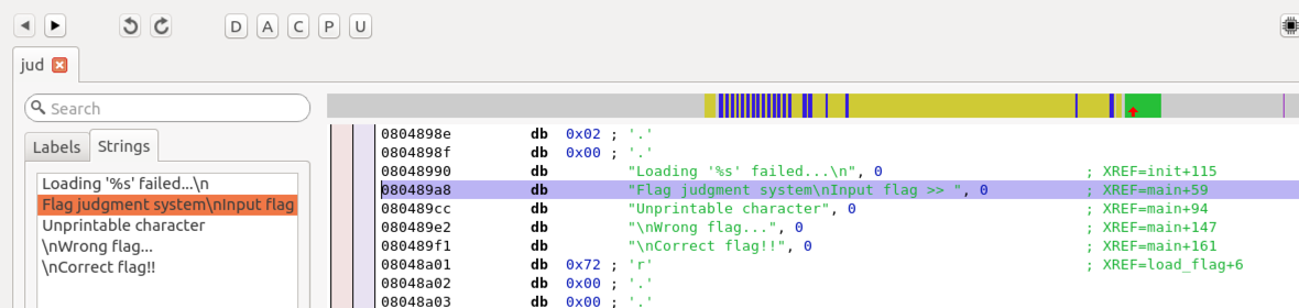 There are five strings in this program, as shown below. Looking at the right, I can see three modules: "init", "main", and "load_flag".