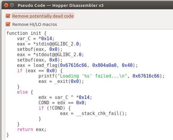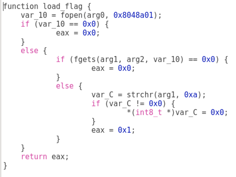 Repeating the process, starting from the strings, I entered "load_flag" and got its pseudocode.