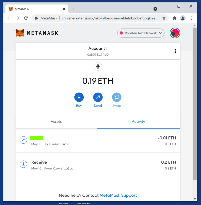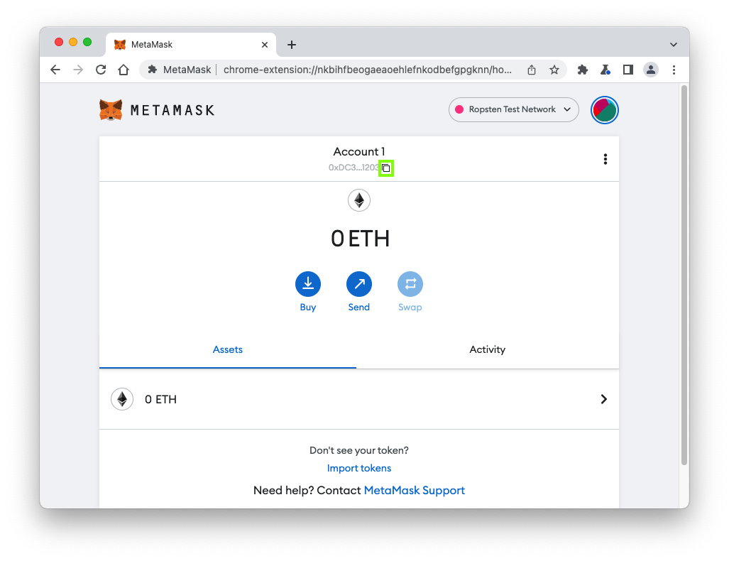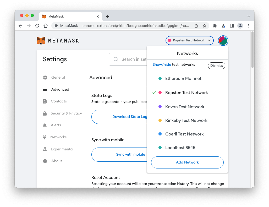 If the Ropsten network is not visible, click the "Show/hide test networks" link.