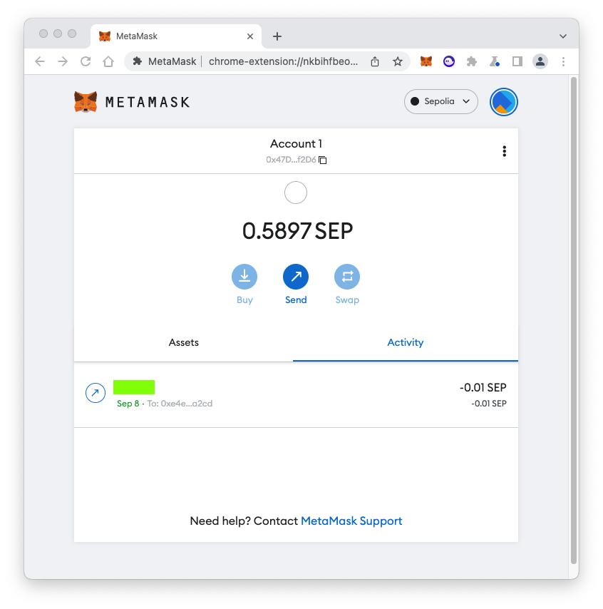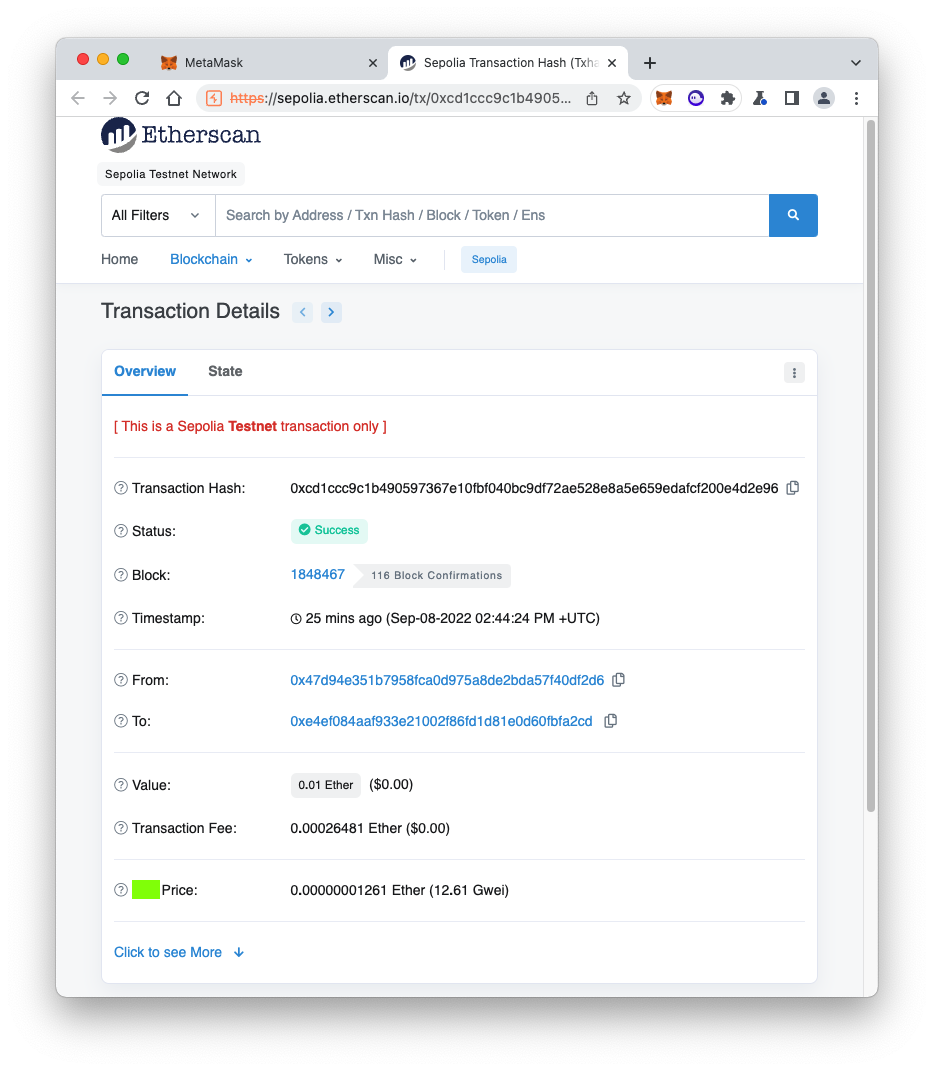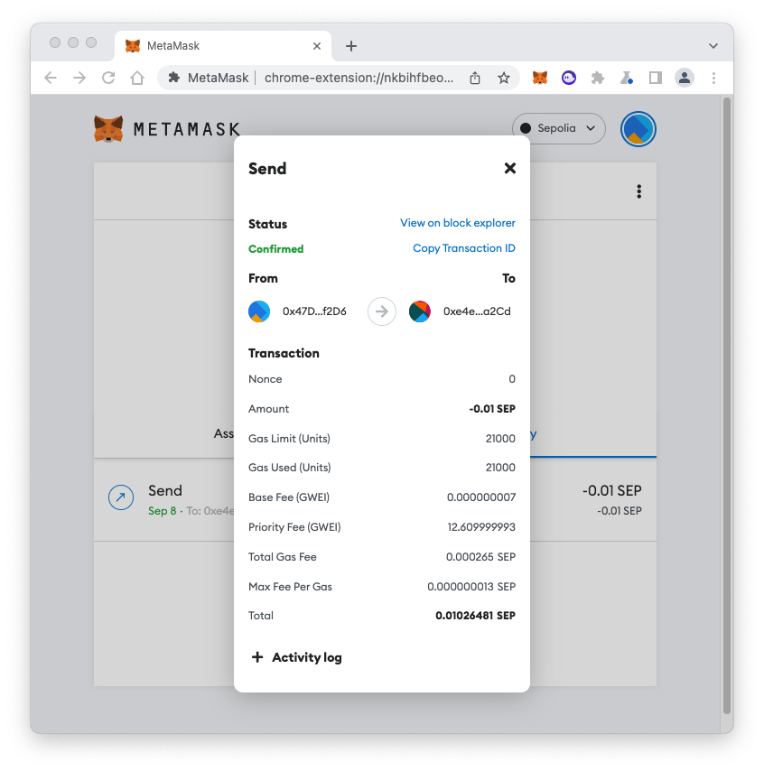 A box pops up with more information. At the top right, click "View on block explorer" to view this transaction on Etherscan, as shown below.