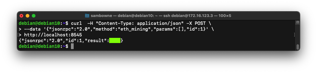 curl -H "Content-Type: application/json" -X POST \ --data '{"jsonrpc":"2.0","method":"eth_mining","params":[],"id":1}' \ http://localhost:8545