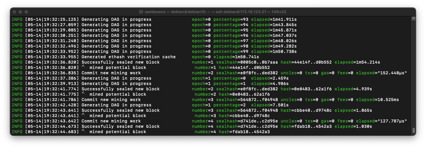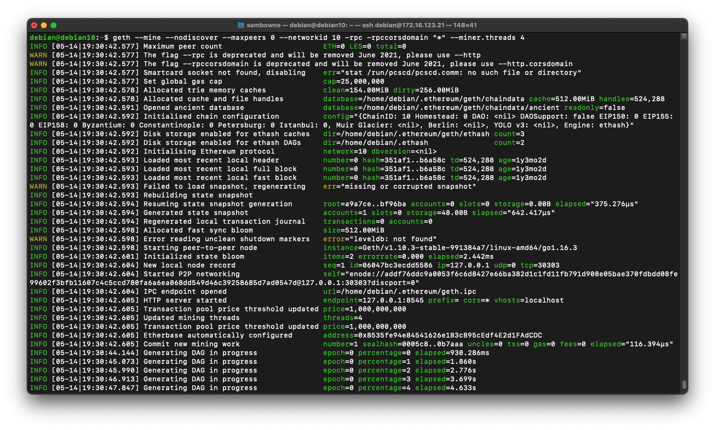 Geth starts, as shown below. It begins "Generating DAG". The DAG is a 1 GB file used for "proof of work", as explained here.