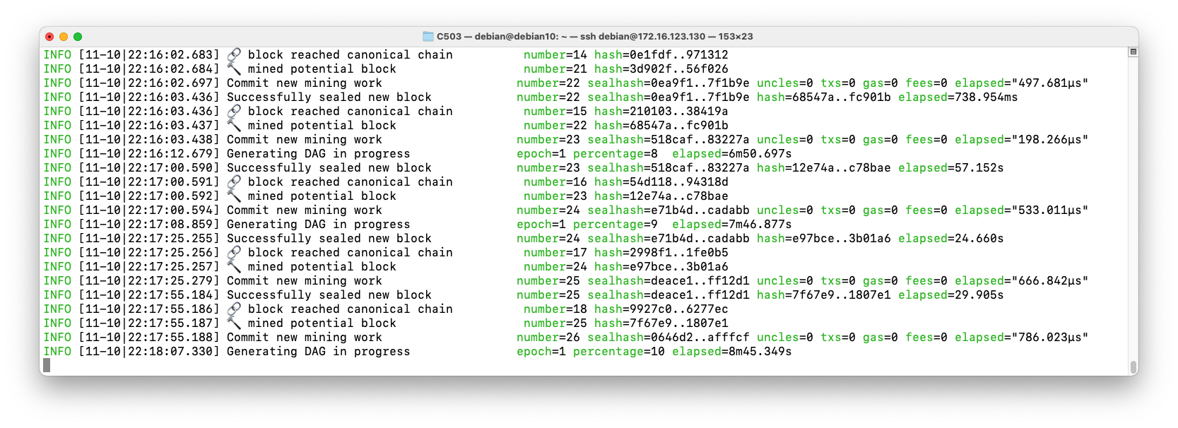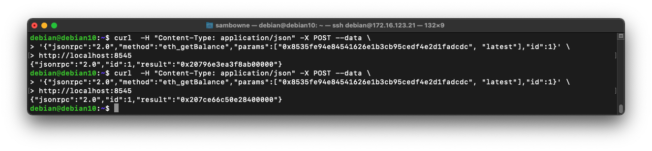After a few seconds, repeat the command again. Your balance is increasing, as shown below, as you earn rewards for mining blocks.