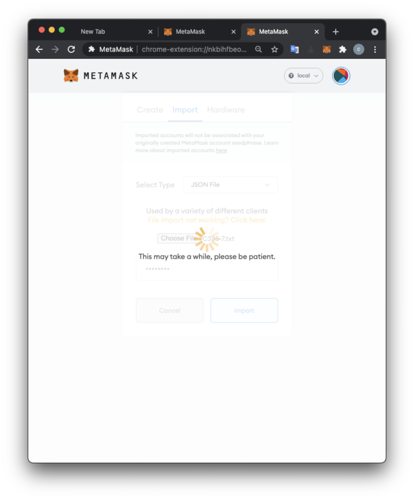 The import is working, but it is incredibly slow, due to a known bug in MetaMask.