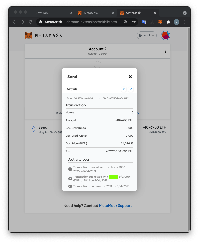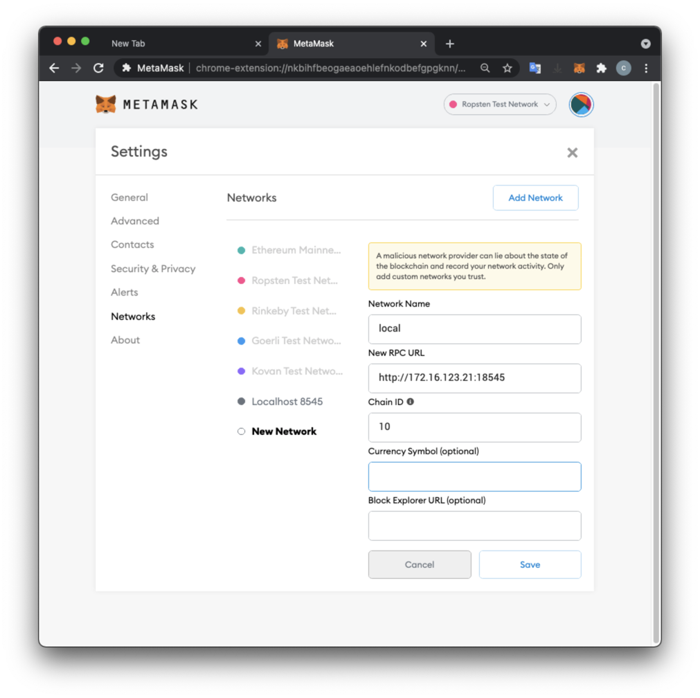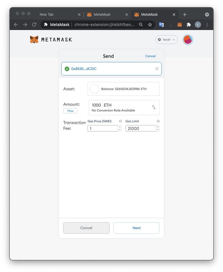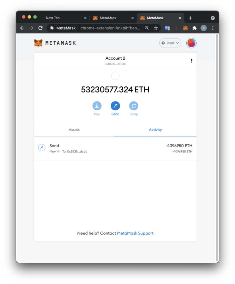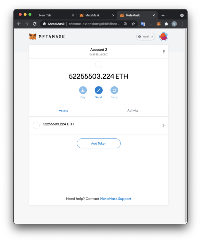 A the top right of the MetaMask page, the network name is now local, and your balance is 0 ETH, because the account in your wallet is not the account you used to mine on your local testnet blockchain.