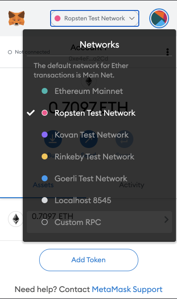 At the top center, click "Ropsten Test Network" and click "Custom RPC", as shown below.