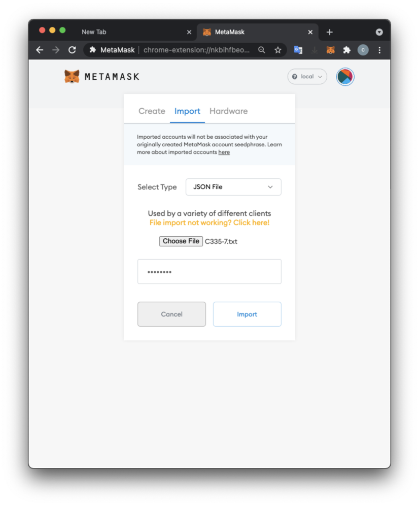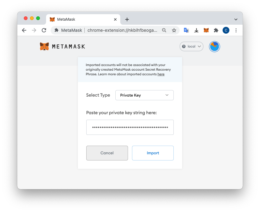 Copy that private key, excluding the prefix "0x". Paste it in to Metamask, as shown below, to import your account.