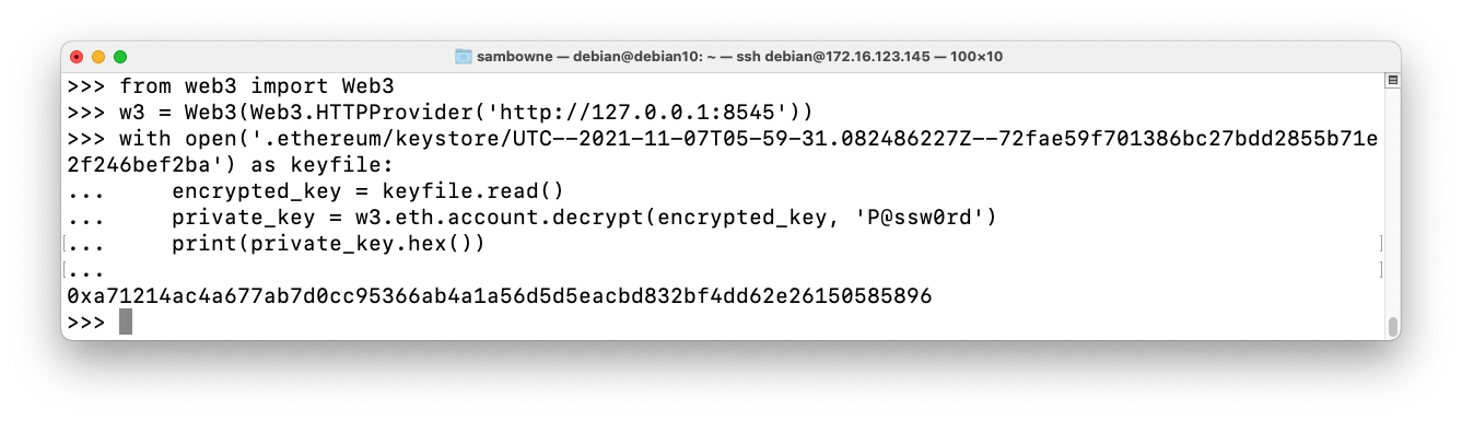 python3 from web3 import Web3 w3 = Web3(Web3.HTTPProvider('http://127.0.0.1:8545')) with open('.ethereum/keystore/UTC--2021-11-07T05-59-31.082486227Z--72fae59f701386bc27bdd2855b71e2f246bef2ba') as keyfile: encrypted_key = keyfile.read() private_key = w3.eth.account.decrypt(encrypted_key, 'P@ssw0rd') print(private_key.hex())