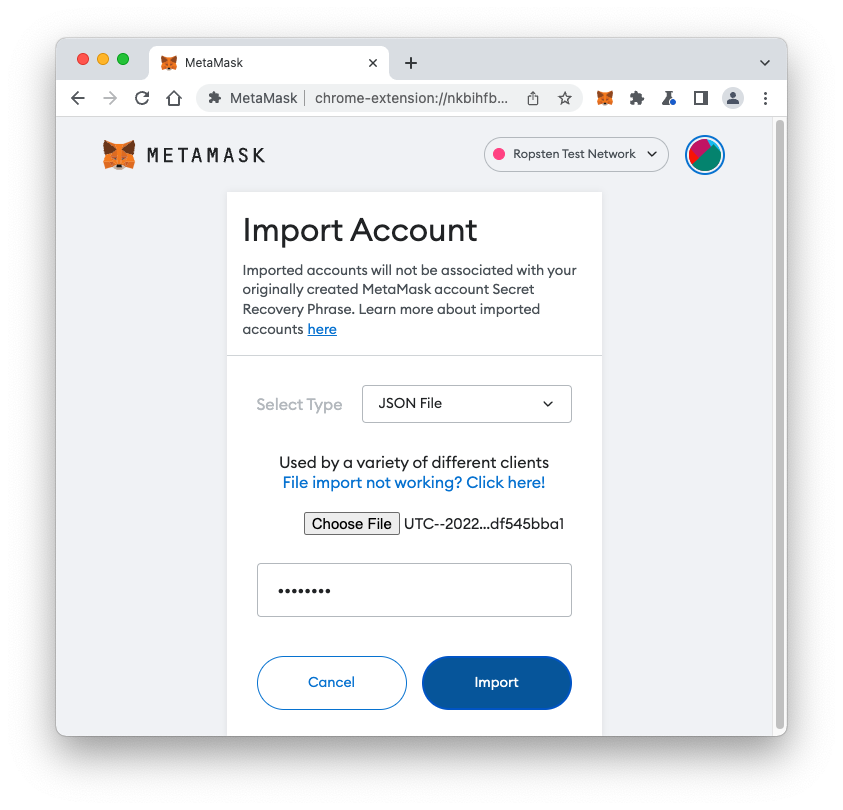 On the Import Account page, select a Type of "JSON File".