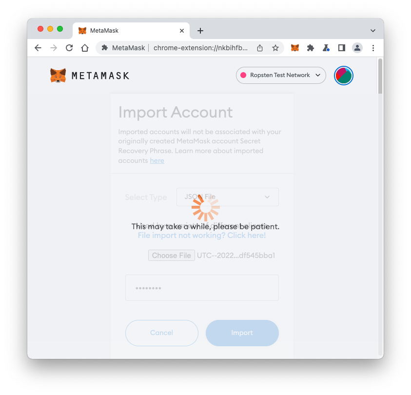 The import is working, but it is incredibly slow, due to a known limitation of MetaMask.