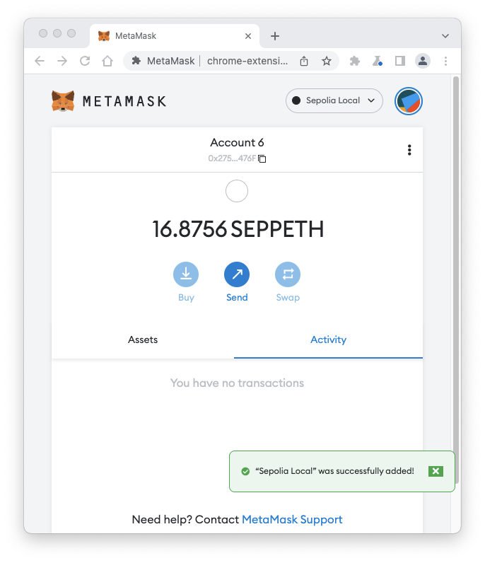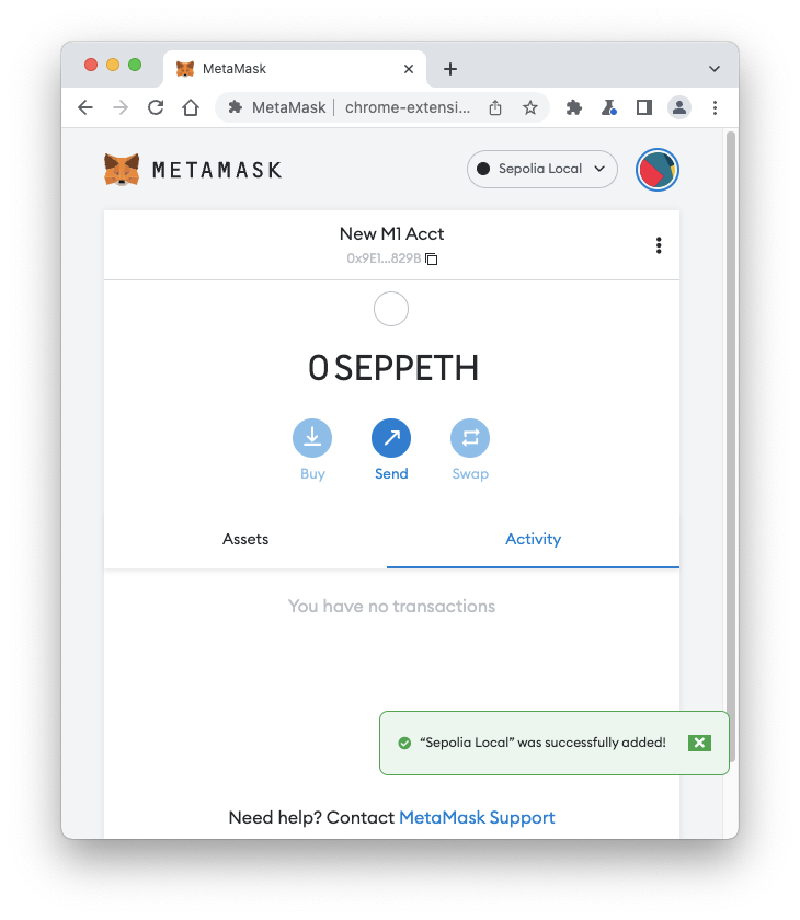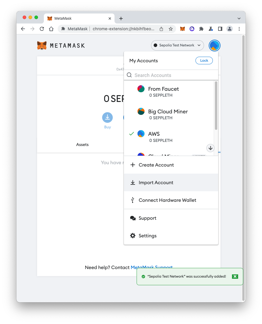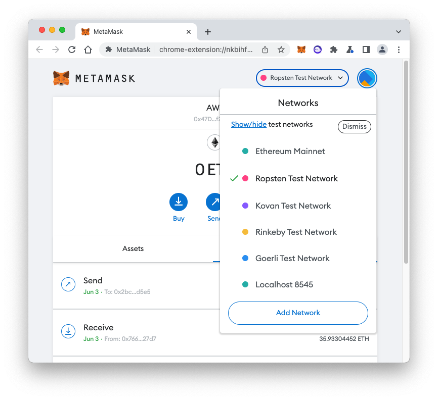 Open MetaMask. At the top right, click the network name. Click the "Add Network" button, as shown below.