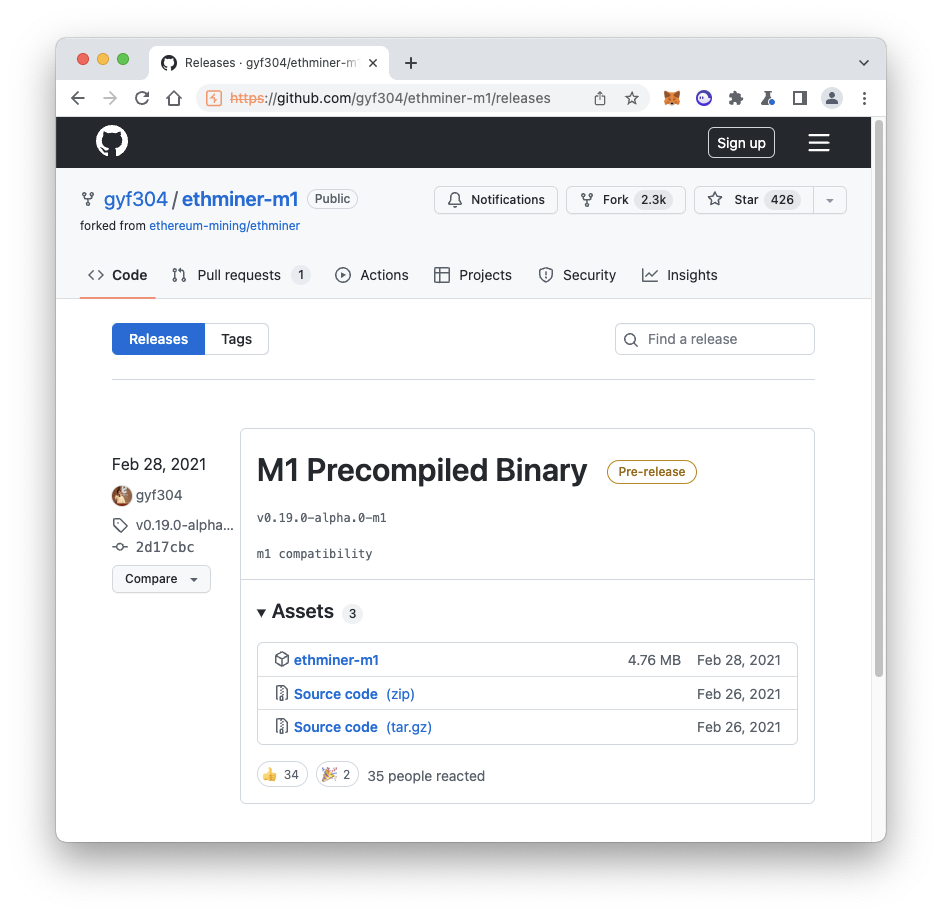 In the "M1 Precompiled Binary" section, click the arrow next to Assets to expand that section, and click ethminer-m1, as shown below.The program downloads into your Downloads folder.
