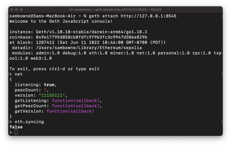 When the synchronization process is complete, The "eth.syncing" command will respond with "false", as shown below.